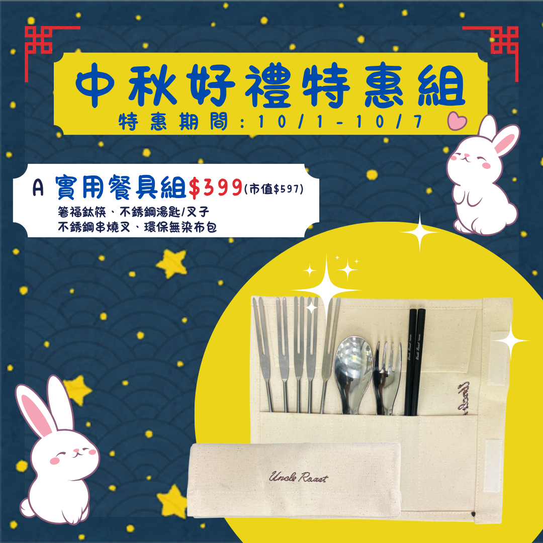 夯伯實用餐具組🥤內容物:不鏽鋼串燒叉5支、不鏽鋼湯匙/叉子各1支、箸福鈦筷1雙、環保無染布包1個🥤特惠價:$399/組(市值$597)🥤特惠期間:即日起至10/7止注意事項:1.活動到期將恢復原價2.特殊限量商品售完為止。3.此優惠價為LINE會員限定,不與其他優惠活動併用。4.碩湛保有最終解釋權。